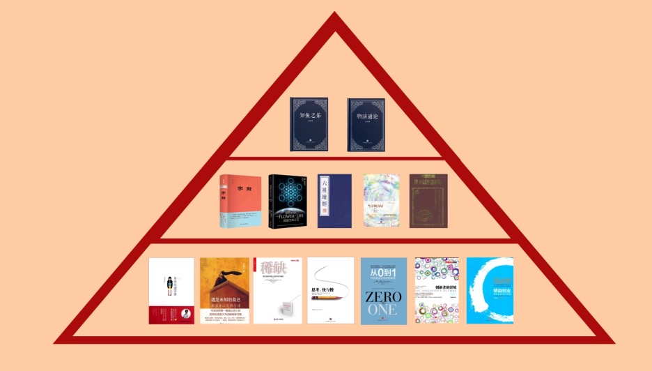 书没有高低,只有合适不合适。我在未来很长一段时间都是在讲书中的内容,但是为了表达方便,肯定不会按书的顺序来讨论。文字的最大信息存载量肯定是大于说话的,如果你希望看到更多的细节,你还是得看书的原著。这些书很多,你也不一定就要从金字塔的下端读起,只要你看的书能触动到你,或者引发你的联想那就是一本好书。古代有个老和尚最后的开悟竟是在路过妓院的时候妓女说的一句黄语,所以看书的重点在你。切记,读书是一项兴趣,就像玩游戏,怎么开心怎么来。